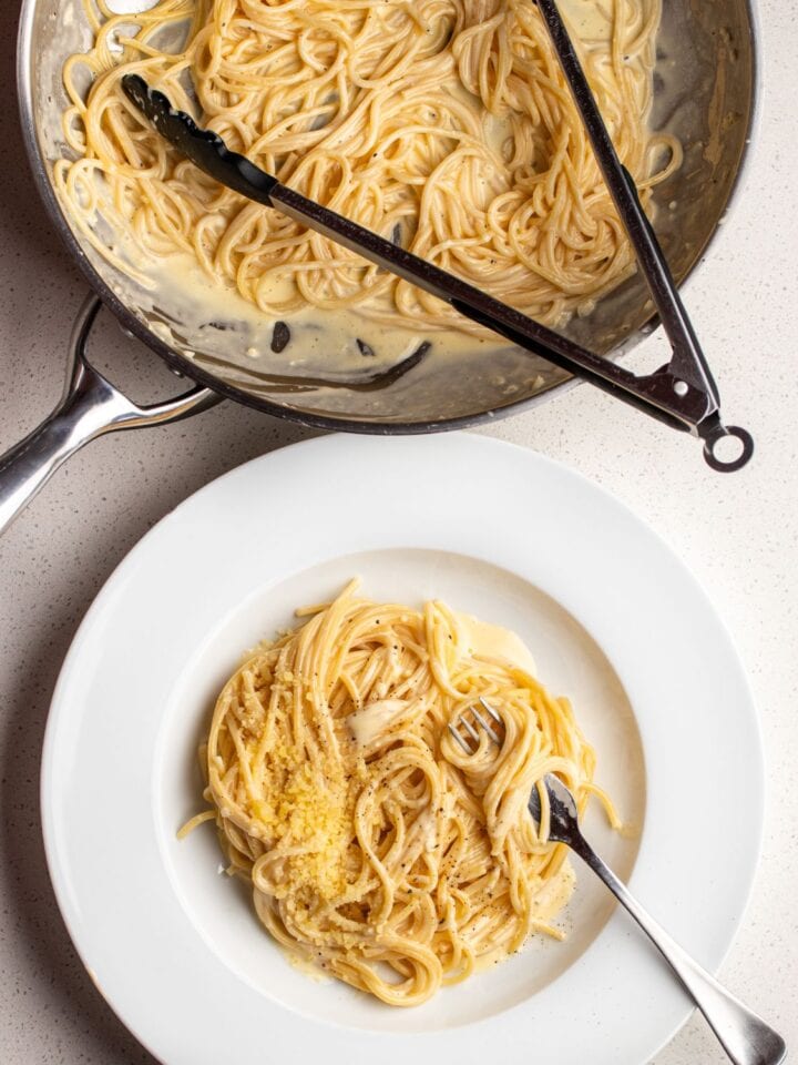 The Parmesan needs to be so finely grated to melt into the cream smoothly. A microplane is great or the star side of a box grater. Do not use pre-shredded cheese, it is full of additives that prevent a smooth melt.