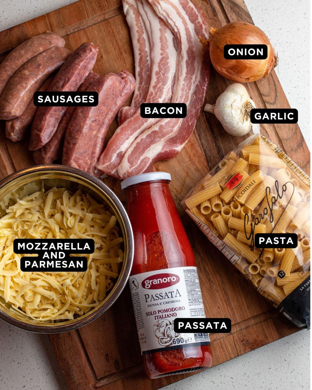It’s super simple to make, with a mixture of pork and beef sausages flavoring a rich tomato sauce. Crispy bacon adds a little extra punch, while parmesan and mozzarella melt into a golden, bubbling topping. If this is your first time making a pasta bake, you’re in for a real treat.