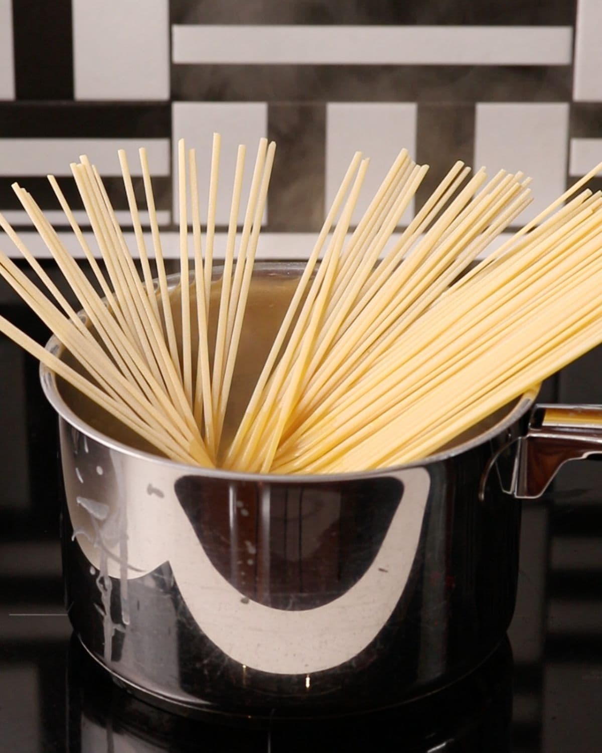 - Use a long pasta shape. A long pasta shape like spaghetti, linguine or fettuccine works best for this method as it’s easier to toss and spin in the pan.