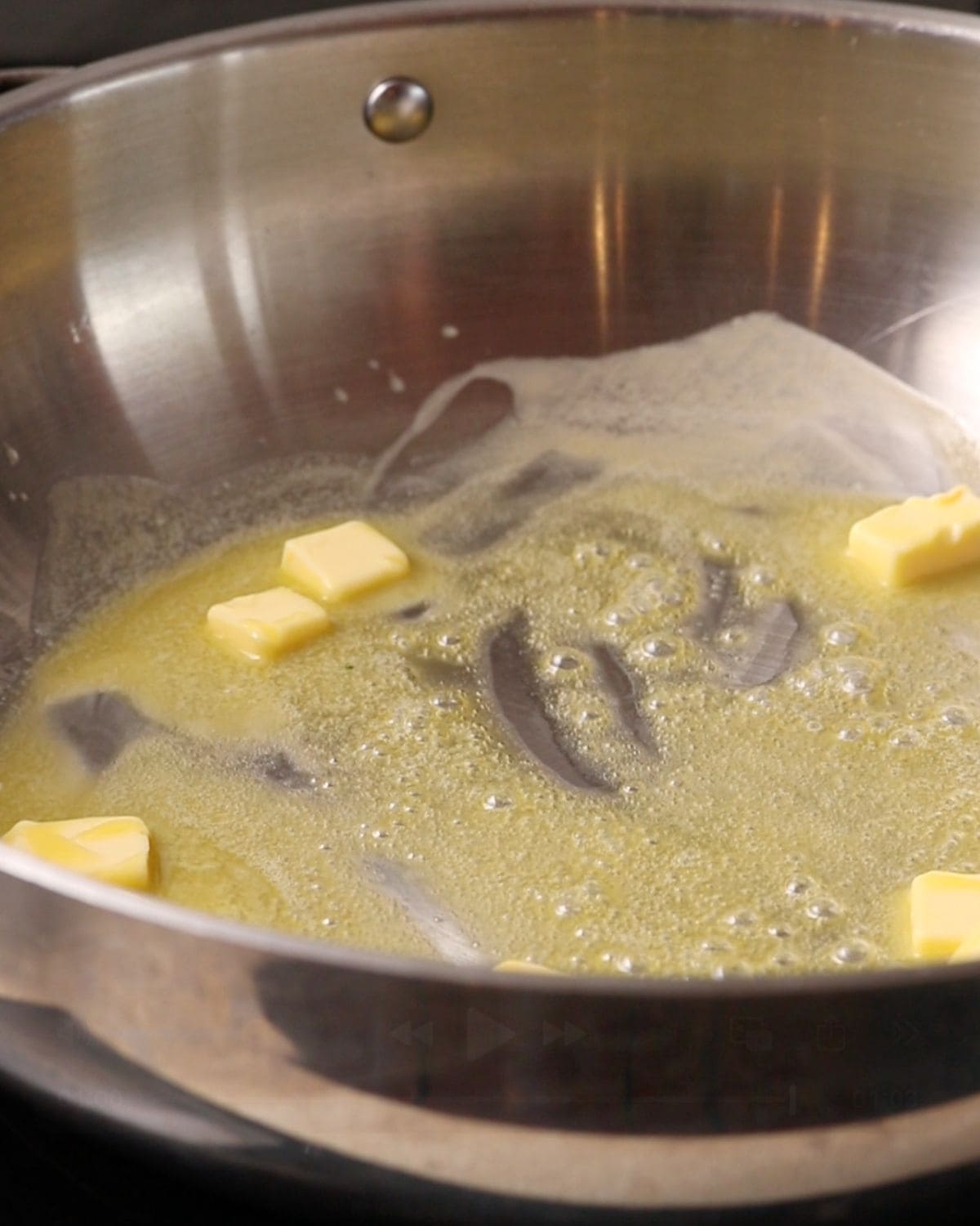 2. When the pasta has four minutes left, melt the butter in a large skillet over a medium heat.