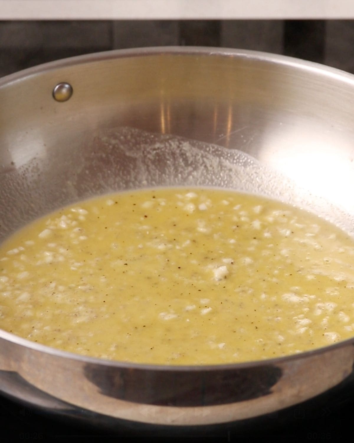 - When the pasta has four minutes left to cook, melt the butter in a large skillet over medium heat. Add the black pepper, minced garlic (and red pepper flakes if using) and cook for about 30–60 seconds, stirring, until fragrant. Be careful not to let it brown.