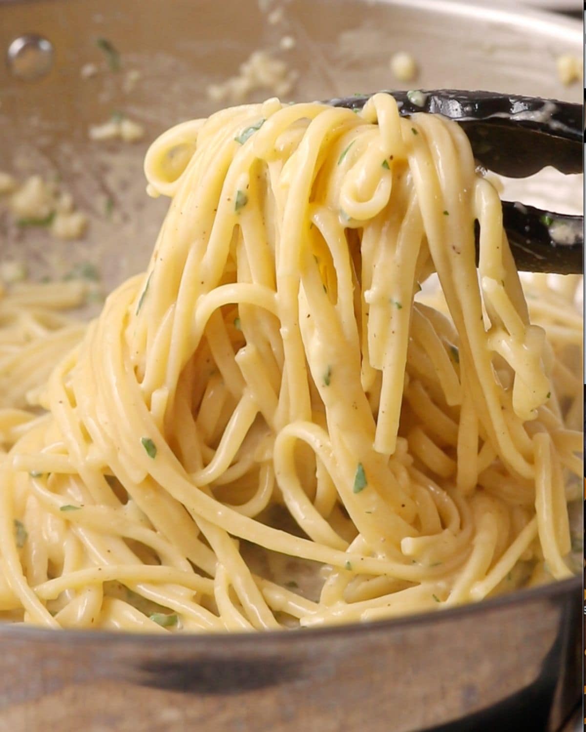 - With tongs toss or spin continuously until the cheese melts into the sauce and it becomes silky and emulsified.